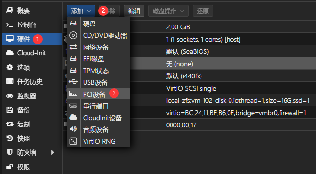 然后为虚拟机添加PCI设备。