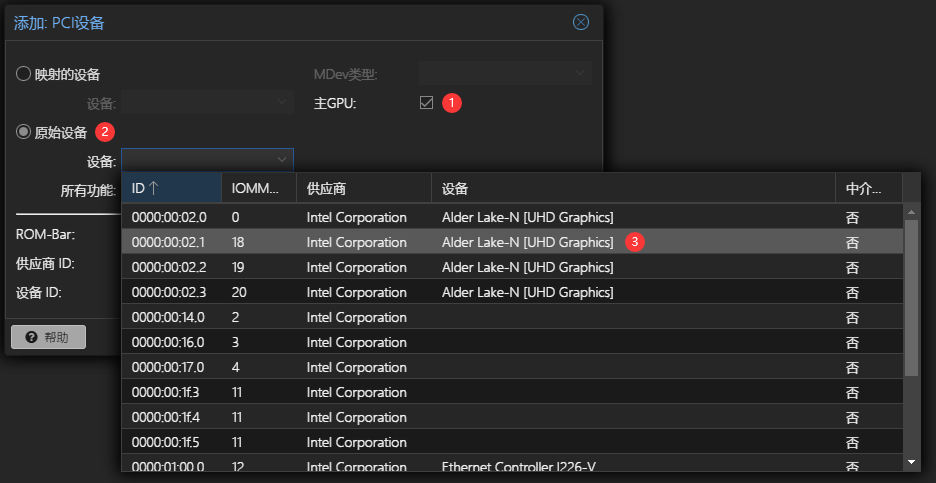 这里需要注意的是不要选择0000:00:02.0设备(其他比如0000:00:02.1,0000:00:02.2都是可以的),以及不要勾All Functions(All Functions会将的VF都会被分配到一个虚拟机中),安装Win虚拟机时需要勾选主GPU